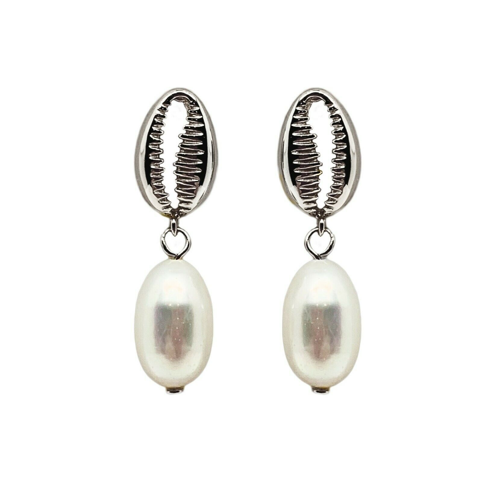 White Synthetic Oval Pearl and Cowrie Sea Shell Sterling Silver Dangle Earrings