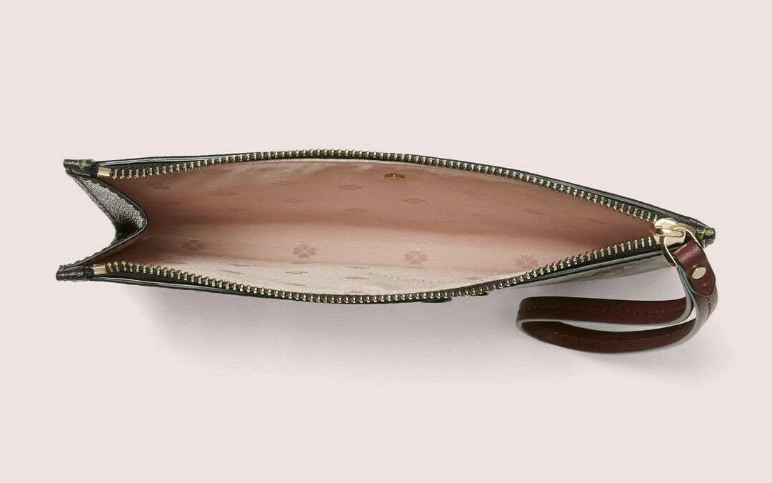 by the curves of the spade. this small wristlet, made from durable faux leather, is designed to give
