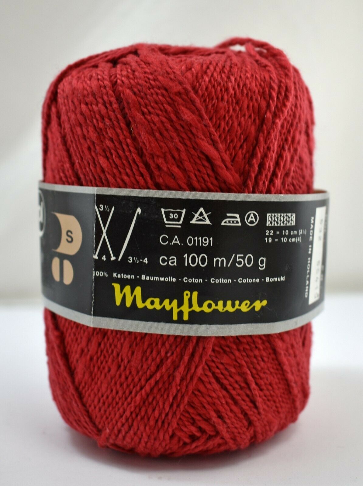 One skein/ball of Scheepjeswol Granada yarn. Color Red #532, lot 56415. 100% Cotton; machine wash. Made in Holland.