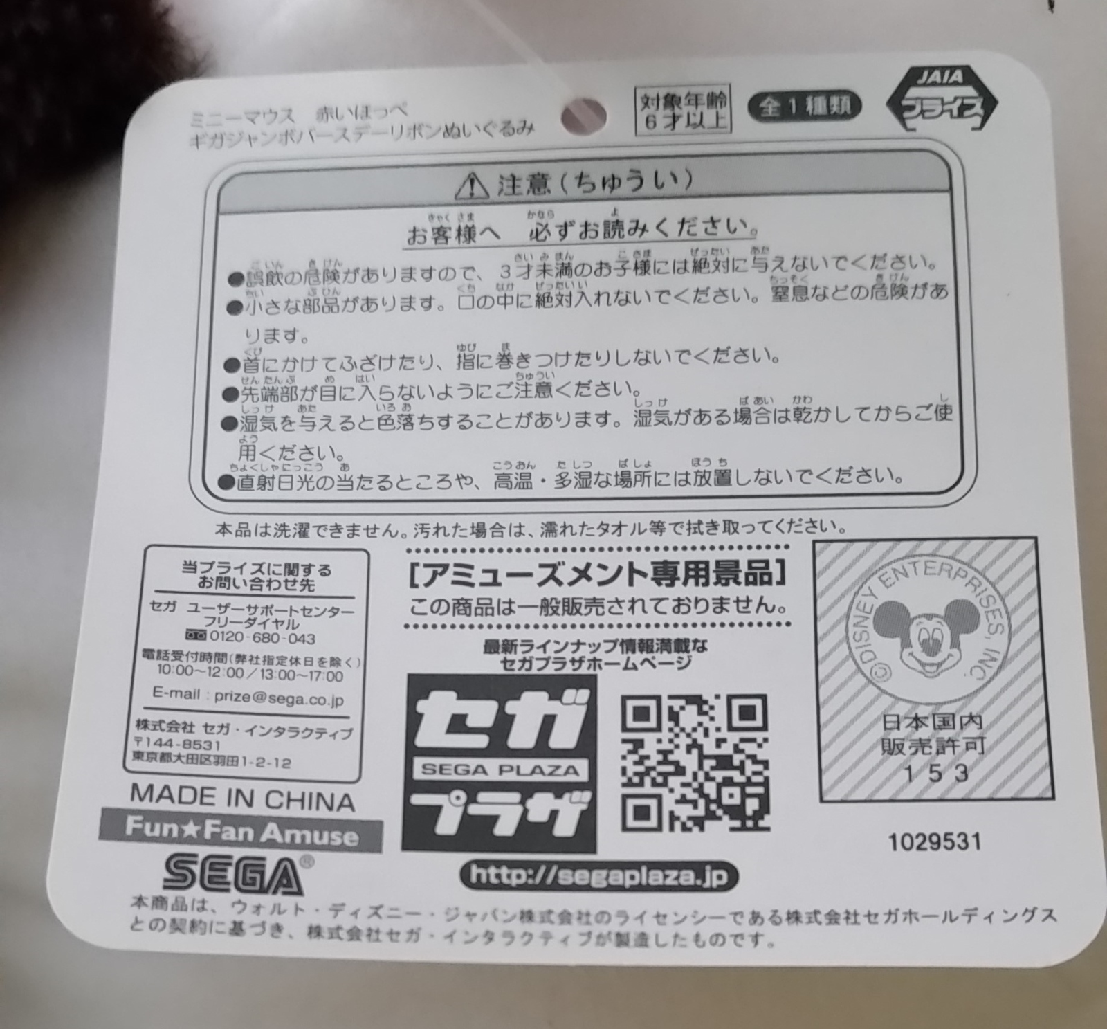 You are bidding/buying a Disney - Minnie Mouse Jumbo Red Cheeks Toreba claw machine win!