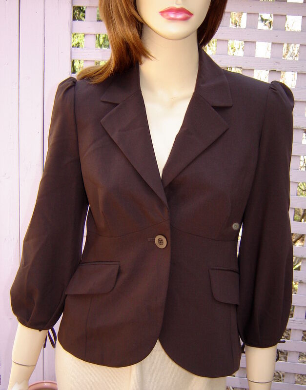 This unique jacket has a single brown button closure in front, two angled front pockets with flaps, and a vented back hem. The 3/4-length sleeves have puffed shoulders and pleated balloon cuffs (with notches and ties). Figure-flattering princess seams.