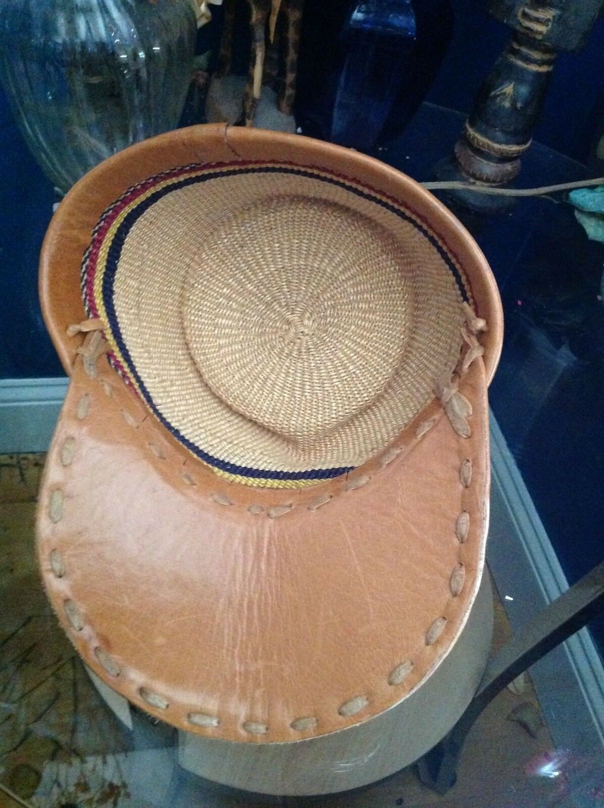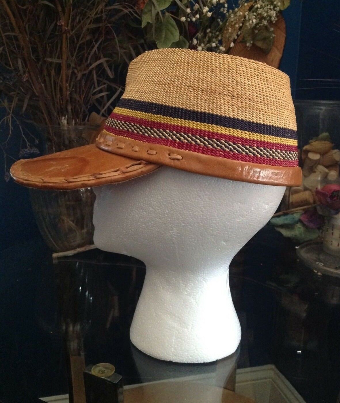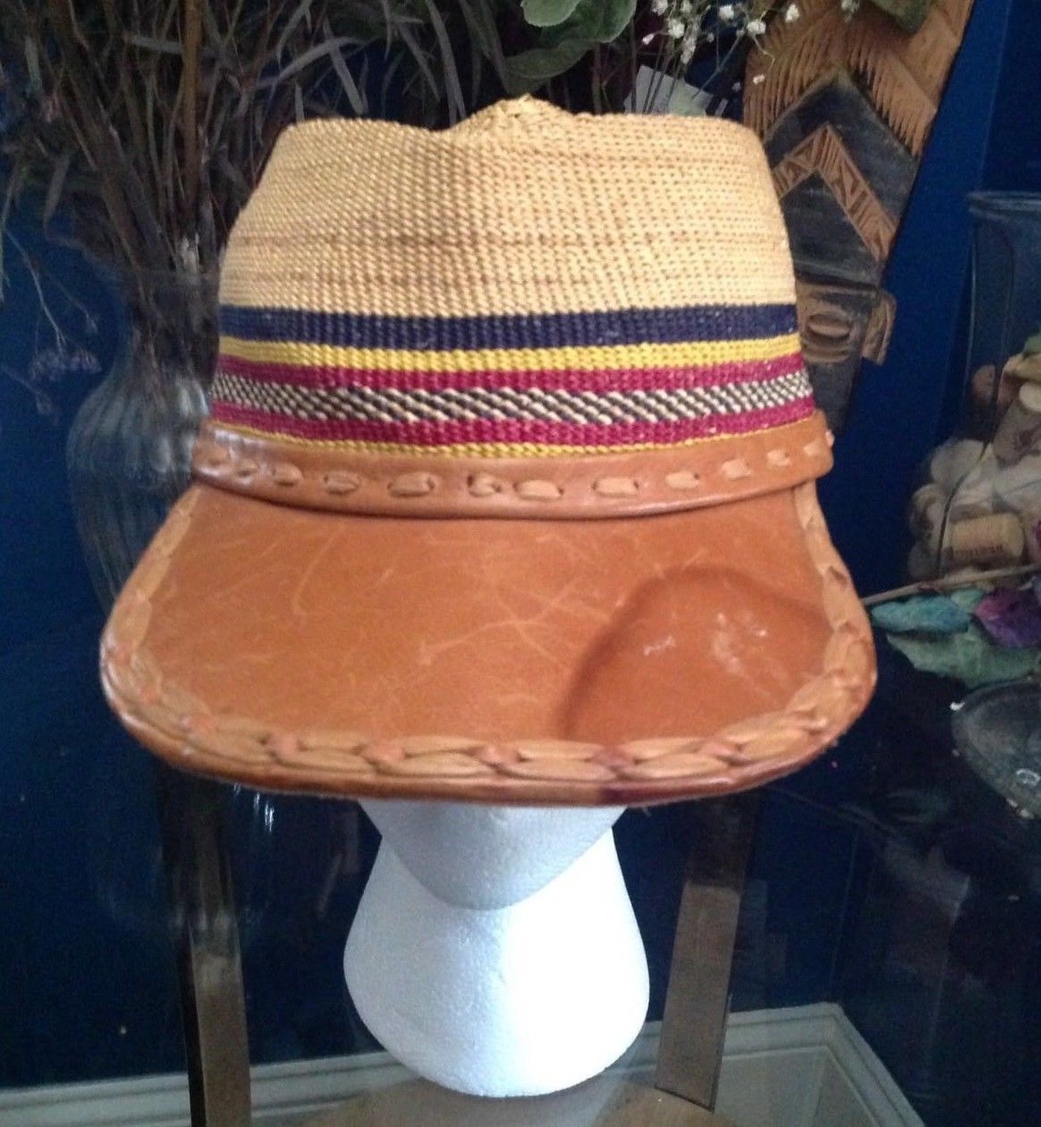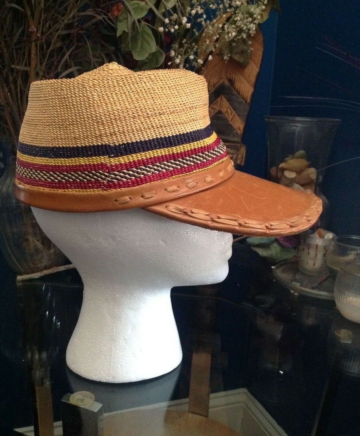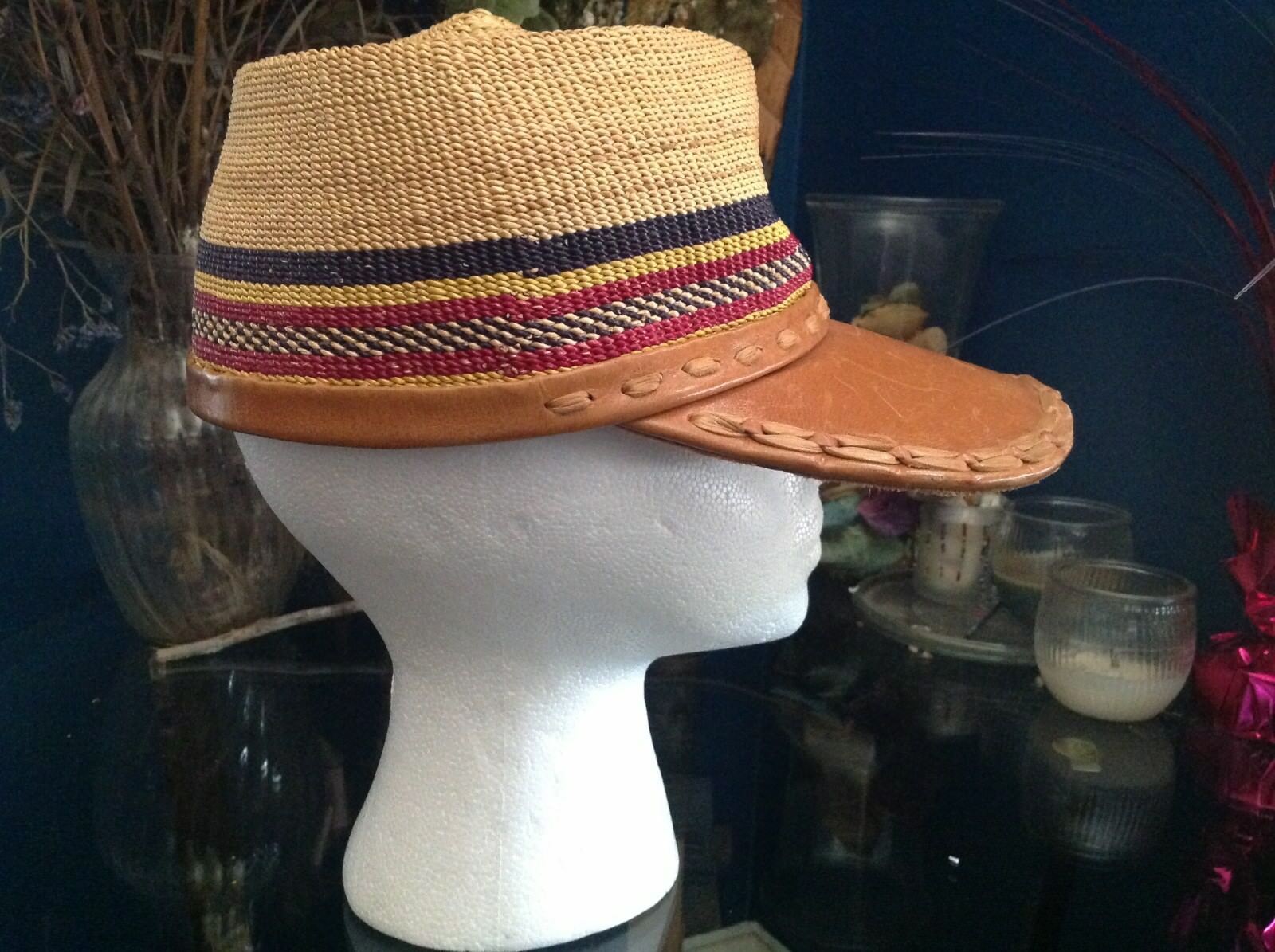 Ghana Ghanian Weave/ with Leather Brim Ethnic/ Cultural Fitted Hat Hand Made, the hat is 10 inches long , the fitted hat area is 6.5 inches and sits on top of the head , pre owned in good condition, has a stain on the Brim , may be fixed with leather seal
