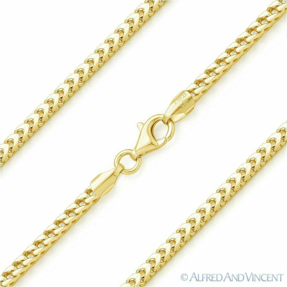 The featured Italian-made 1.8mm thin chain necklace is made up of arrow-link franco chains cast in solid .925 sterling silver. The chain is then plated with 14k yellow gold and finished with a lobster clasp for secure wear.