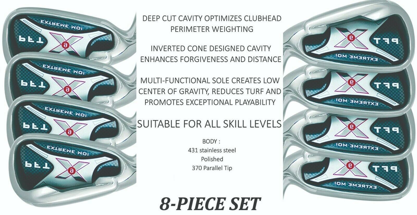 The PFT X9 Irons are constructed from two pieces resulting in a hollow body that moves significant weight to the back and bottom of the club. Two-piece metal wood-inspired construction promotes a low Center of Gravity and high Moment of Inertia. Weight is relocated to the perimeter for enhanced forgiveness. The CG is located deep behind the face for a more solid feel on impact and greater consistency. The wide sole design makes alignment at address easy and promotes a higher launch angle for increased distance. The game improvement of the PFT X9 irons are designed to hit longer and straighter with more accuracy and better feel.