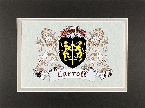 Carroll Irish Coat of Arms Print - Frameable 9" x 12" Authentic Irish coat of arms frameable 9" x 12" inch print. Four piece set includes a high-quality print of your Irish family coat of arms on a heavy 65lb cover weight parchment paper, heavy all-black backing board, and TWO separate matboards. Fits any standard 9" x 12" frame. Authentic Irish coat of arms printPrinted from high quality Vector art filesHeavy duty all-black backing boardNo mounting necessaryTwo separate matboards (inside color: clay, outside color: dark olive)9" x 12" frameable sizeShrink wrapped for deliveryChoose from over 1200 available Irish coat of arms.