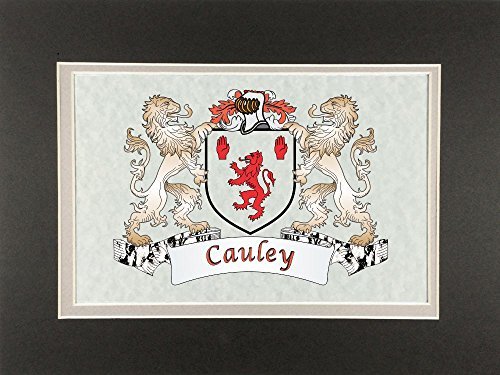 Cauley Irish Coat of Arms Print - Frameable 9" x 12" Authentic Irish coat of arms frameable 9" x 12" inch print. Four piece set includes a high-quality print of your Irish family coat of arms on a heavy 65lb cover weight parchment paper, heavy all-black backing board, and TWO separate matboards. Fits any standard 9" x 12" frame. Authentic Irish coat of arms printPrinted from high quality Vector art filesHeavy duty all-black backing boardNo mounting necessaryTwo separate matboards (inside color: clay, outside color: dark olive)9" x 12" frameable sizeShrink wrapped for deliveryChoose from over 1200 available Irish coat of arms.