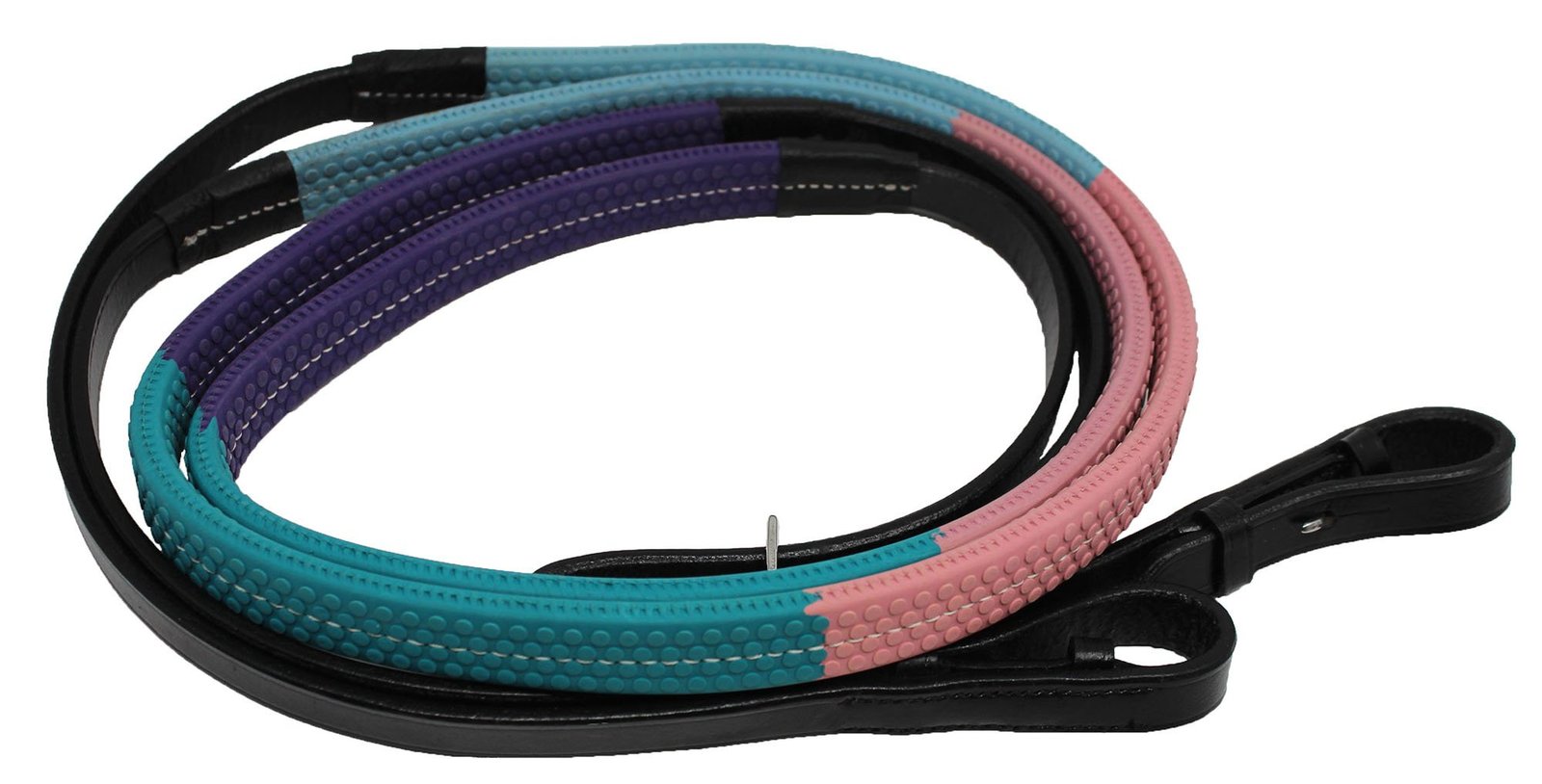 Challenger English Multicolored Rubber Grip leather reins. Rubber grip helps with slippage, providing a more secure feel in your hands. Features rust-free stainless steel hardware. Hook stud bit ends. Measures 54" (Full) long x 5/8" wide.
