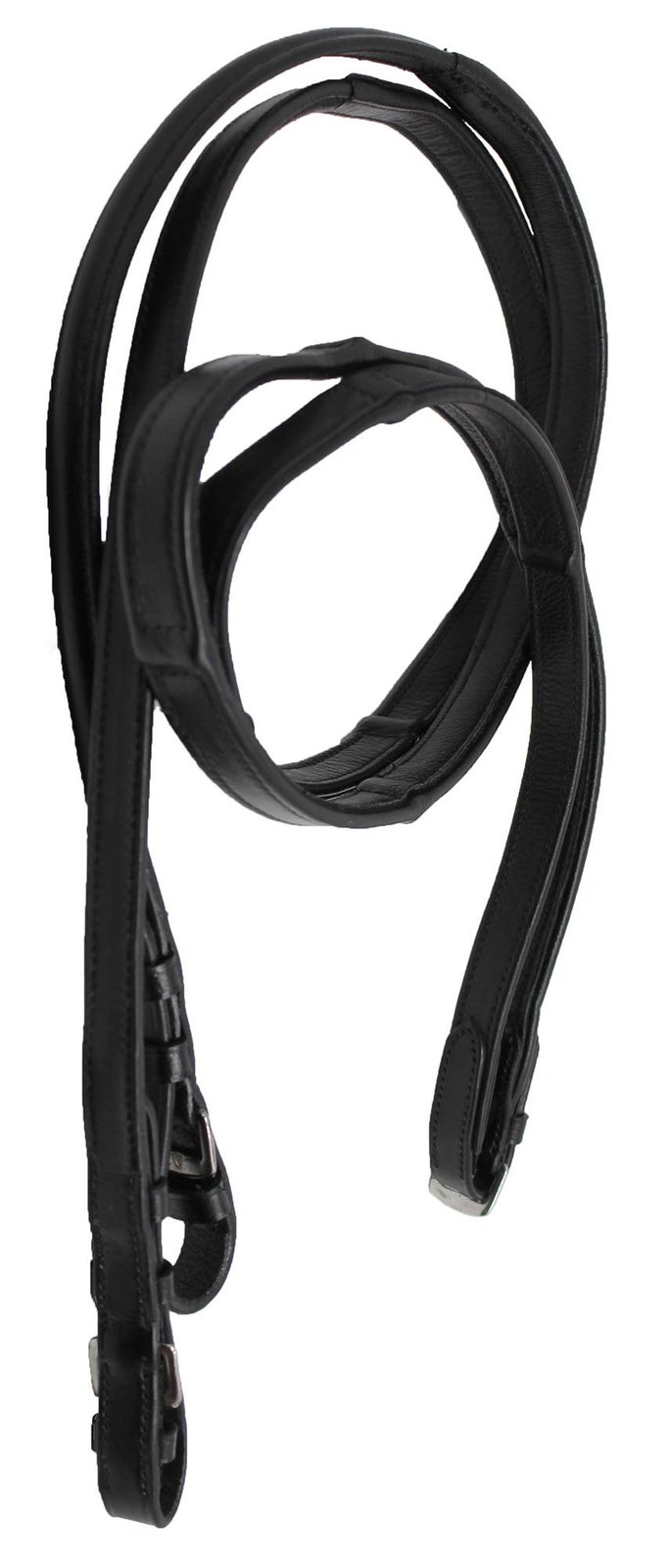 Challenger English 54" long x 5/8" premium soft padded supple leather reins. These reins offer a comfortable feel while the leather stoppers provide grip to prevent slippage. Features rust-free stainless steel hardware. Hook stud bit ends. Also available