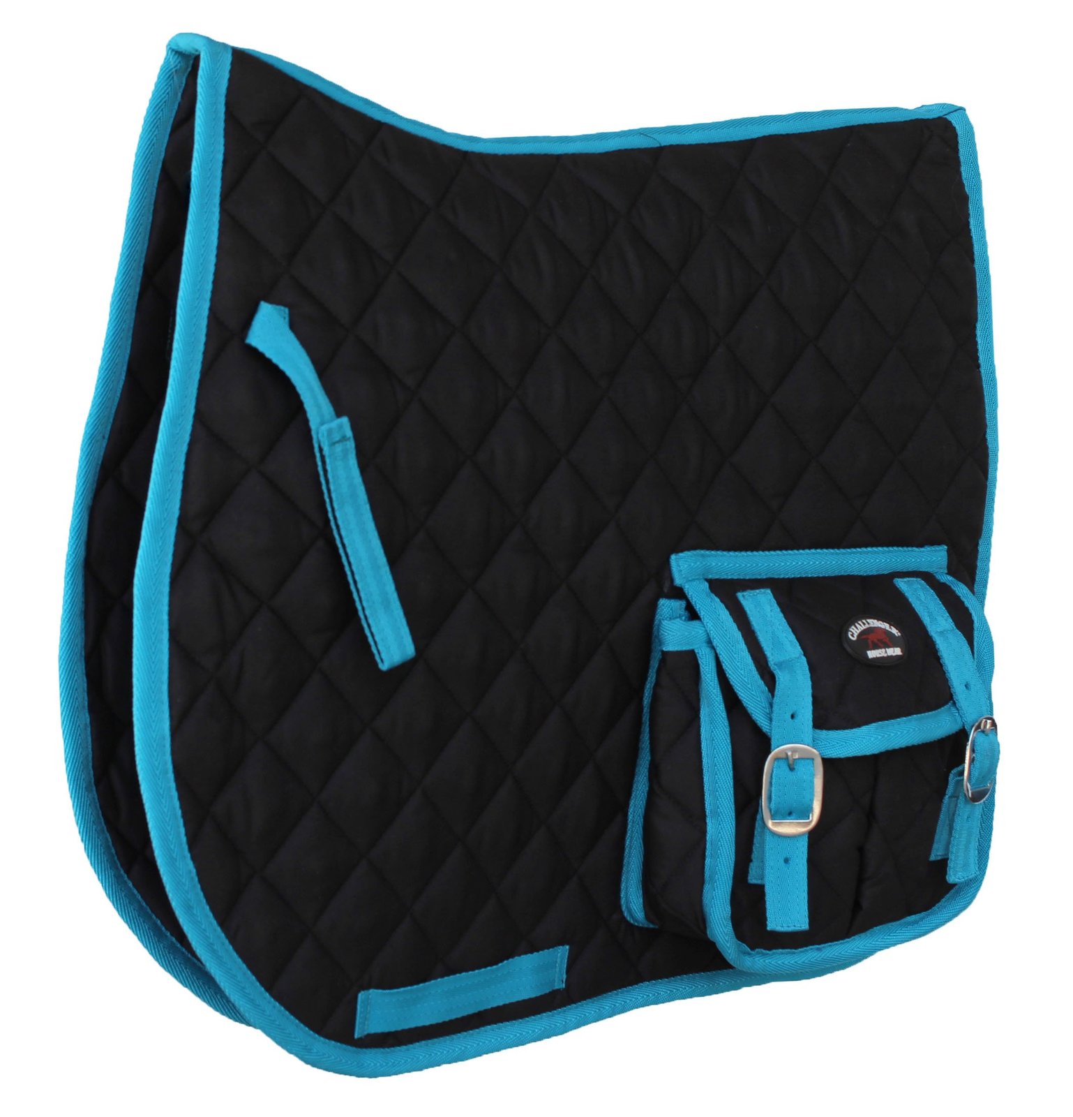 Classic all-purpose contoured pad, with a moisture wicking diamond pattern. Pockets on each side with dual front buckle closures help keep all your items secure while on the trail. Comes in black color with a pacific blue trim. Features durable nylon girth and billet straps.