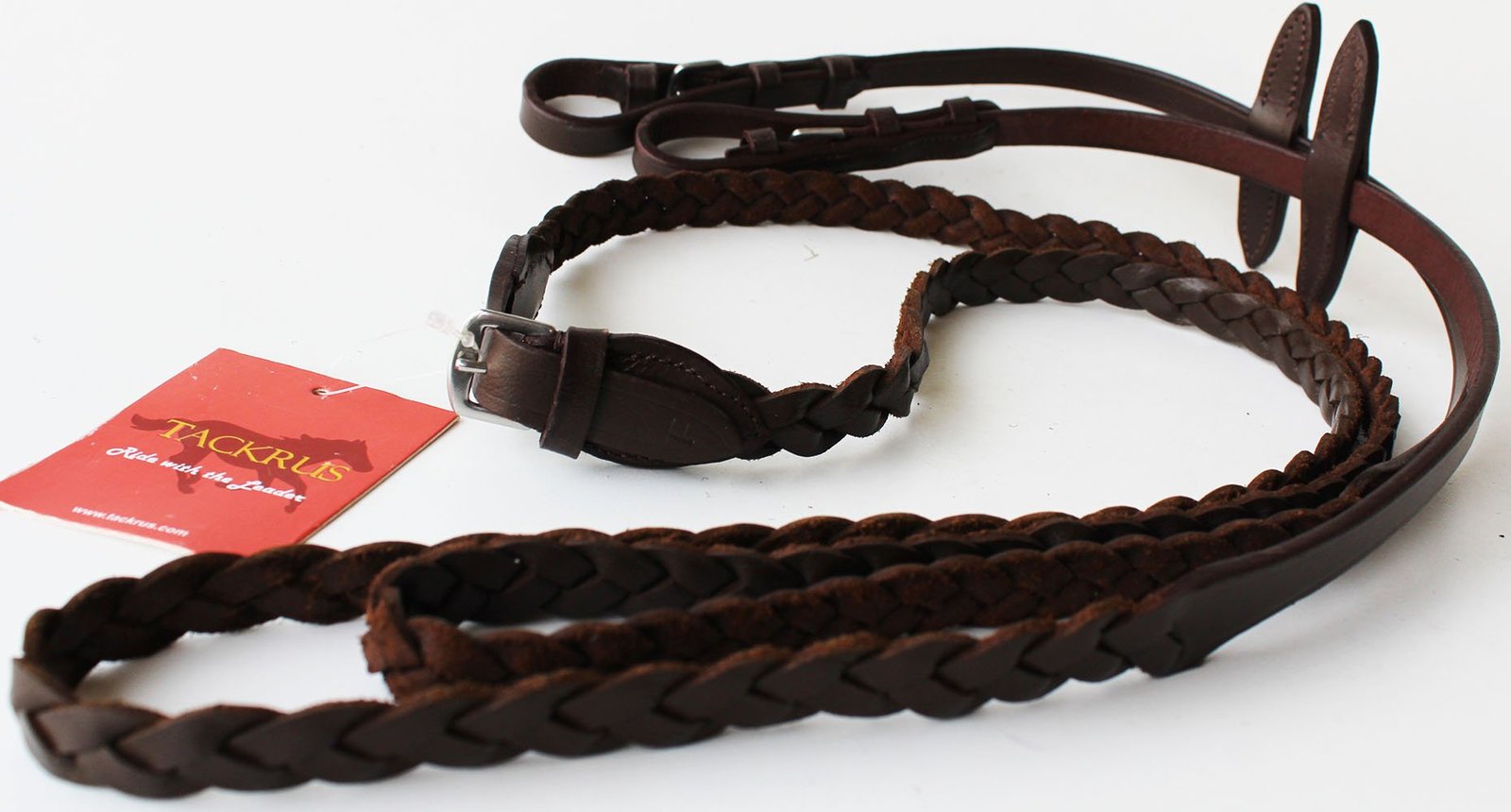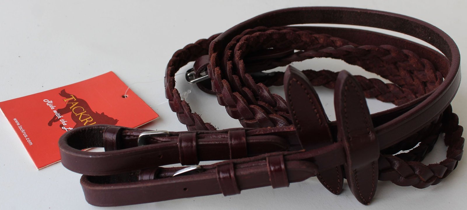 Horse braided leather reins made from 100% genuine leather. Features non-rust stainless steel hardware. Measures 5/8" wide x 8' in length. Also available in Black and Mahogany.