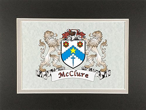 McClure Irish Coat of Arms Print - Frameable 9" x 12" Authentic Irish coat of arms frameable 9" x 12" inch print. Four piece set includes a high-quality print of your Irish family coat of arms on a heavy 65lb cover weight parchment paper, heavy all-black backing board, and TWO separate matboards. Fits any standard 9" x 12" frame. Authentic Irish coat of arms printPrinted from high quality Vector art filesHeavy duty all-black backing boardNo mounting necessaryTwo separate matboards (inside color: clay, outside color: dark olive)9" x 12" frameable sizeShrink wrapped for deliveryChoose from over 1200 available Irish coat of arms.