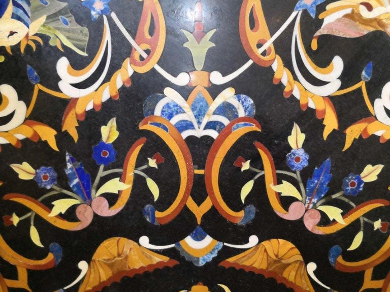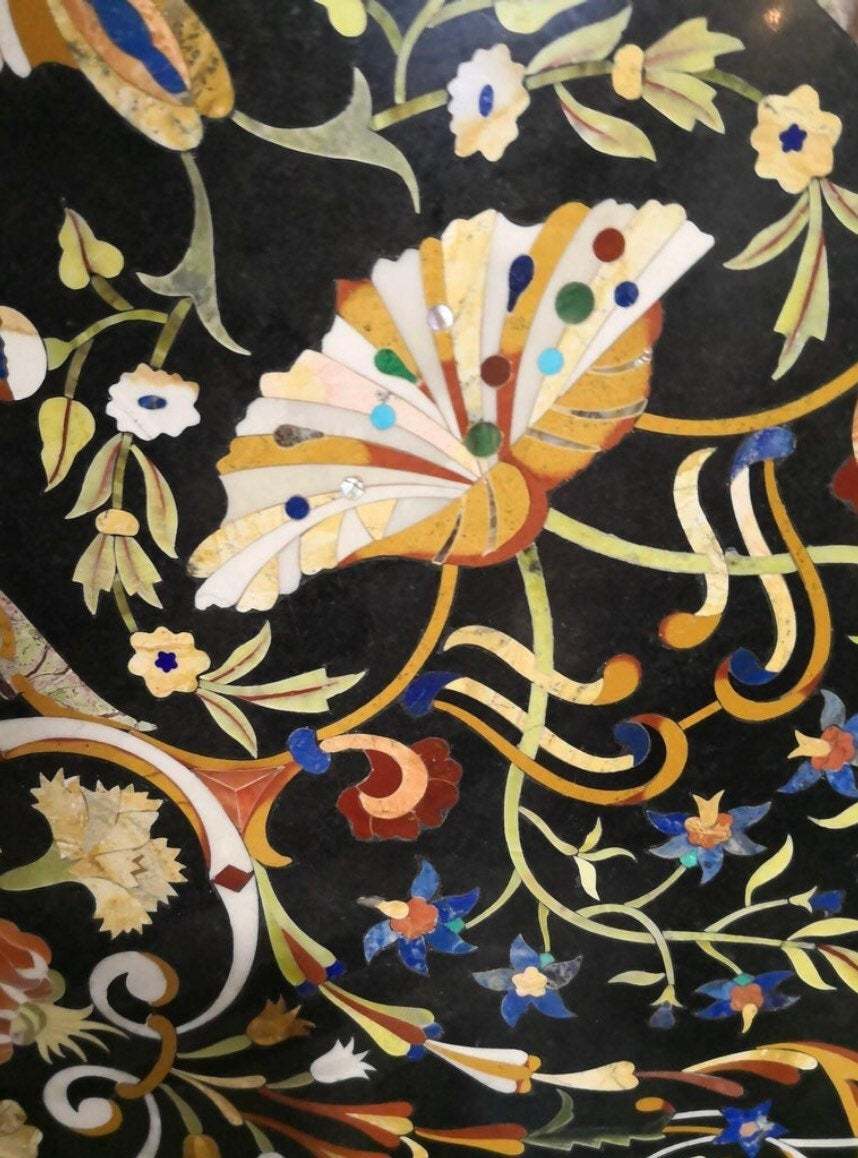 Handcrafted reproduction of Italian 1700s ornamental design on black Belgian marble tabletop. Vases with flowers, clam shells, fishes and a myriad of elements are confirmed by the clever use of Pietre Dure, semiprecious hard-stones: green malachite, dark blue lapis, light blue turquoise, light green jade, mother of pearl, etc.
