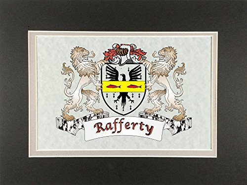 Rafferty Irish Coat of Arms Print - Frameable 9" x 12" Authentic Irish coat of arms frameable 9" x 12" inch print. Four piece set includes a high-quality print of your Irish family coat of arms on a heavy 65lb cover weight parchment paper, heavy all-black backing board, and TWO separate matboards. Fits any standard 9" x 12" frame. Authentic Irish coat of arms printPrinted from high quality Vector art filesHeavy duty all-black backing boardNo mounting necessaryTwo separate matboards (inside color: clay, outside color: dark olive)9" x 12" frameable sizeShrink wrapped for deliveryChoose from over 1200 available Irish coat of arms.