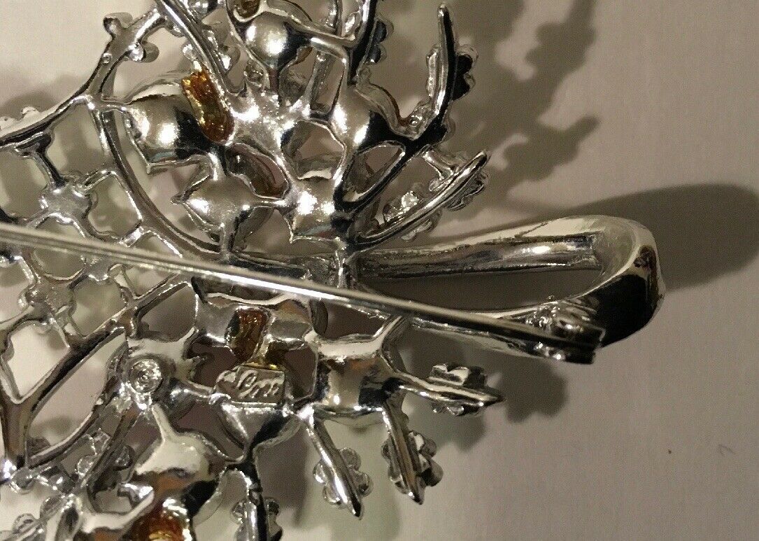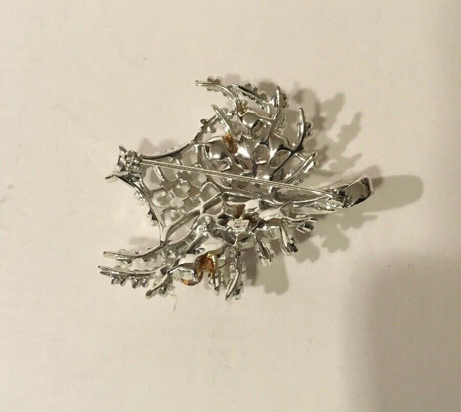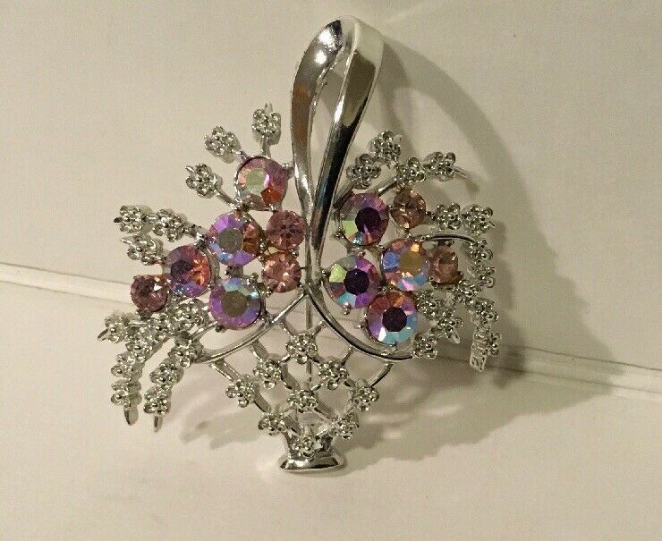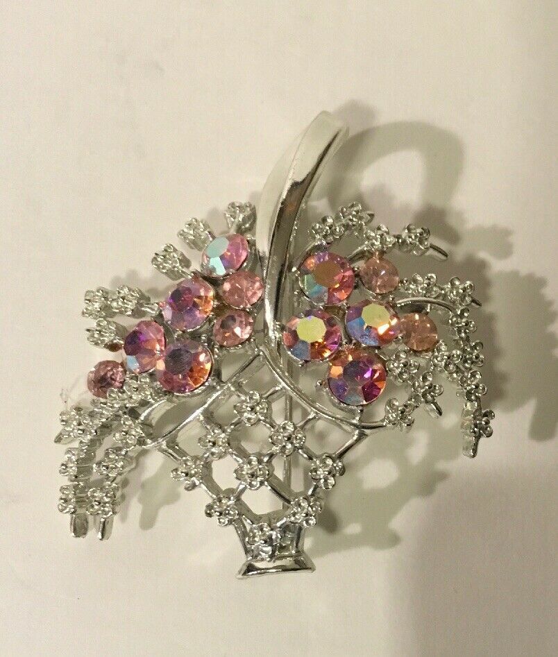 Vtg Coro Pink Aurora Borealis Flower Basket pin. Silver tone with pink iridescent stones. Measures 2 1/4 inches tall and 2 inches tall. Signed Coro on the back. Very good condition.