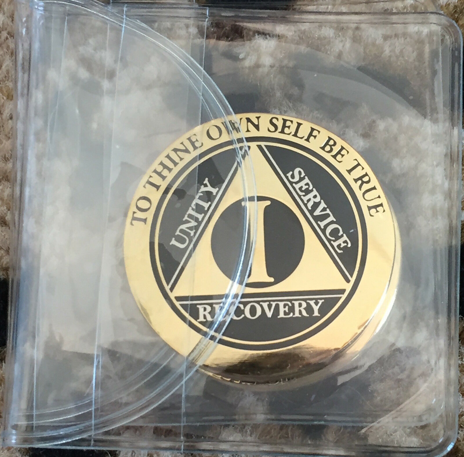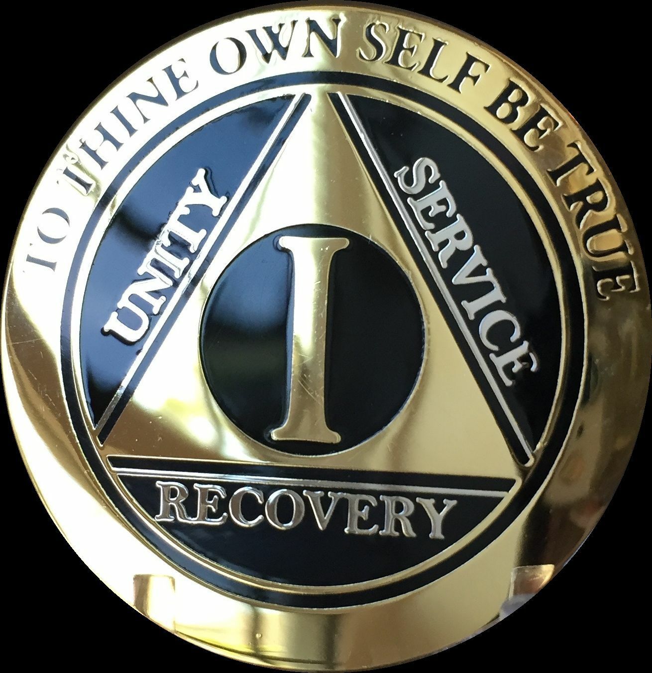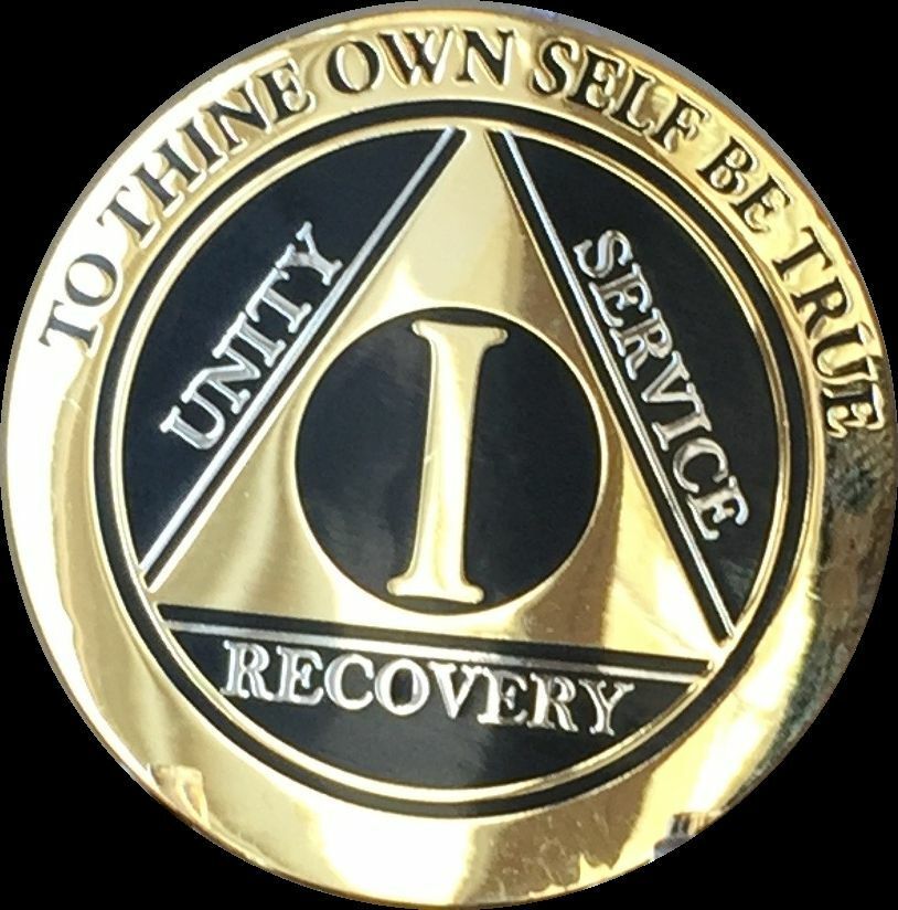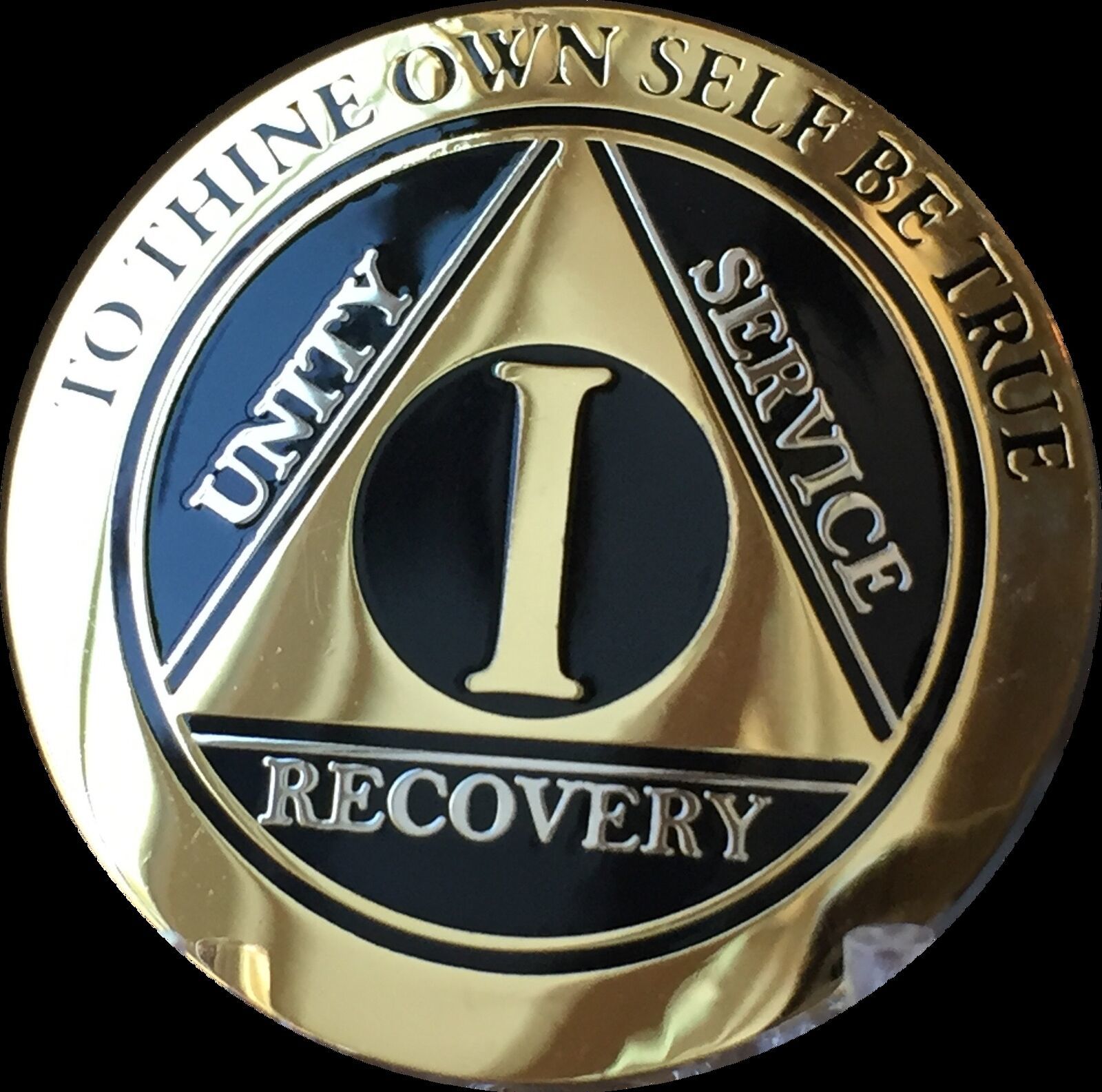 1 Year AA Medallion Black Gold Plated Bi-Plate Alcoholics Anonymous Chip Coin