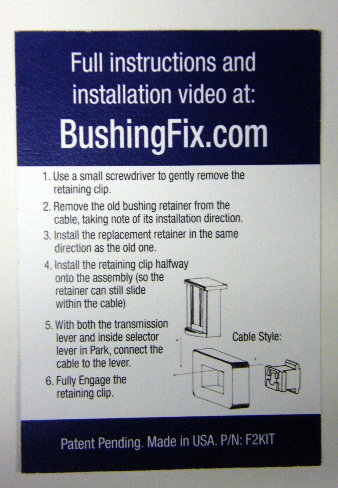 The shift cable repair kit allows you to quickly and easily repair your shift cable by replacing the bushing. This is a complete shift cable repair kit engineered to provide a safe and effective means to replace the transmission bushing. Item includes not only a replacement bushing and the retaining clip. The patent pending custom molded replacement bushing and retaining clip are designed to ensure a quality repair with ease. A professional can perform this repair in under 10 minutes, average time for a non-professional is less than 25 minutes.