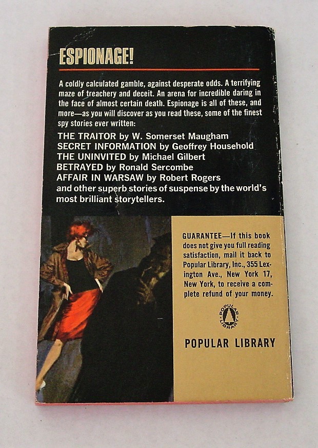 Stories of spies and counterspies by W. Somerset Maugham, Geoffrey Household, John Dickson Carr, Michael Gilbert, Manning Coles, E. Phillips Oppenheim and others. Edited by Marvin Allen Karp. Popular Library SP370. 1965. Tight, clean copy in near fine condition. Unread. Pages white and clean. Minor cover wear (please see pictures).