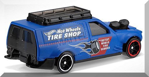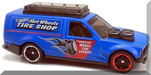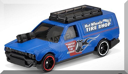 Description: Matte Blue, w/Black interior, Smoke windows, White Black ‘Hot Wheels’ logo w/’Hot Wheels Tire Shop’ in Black rectangle w/Red hash stripes below on rear sides, Black White tire w/flames on sides, Large Red hash stripe on doors w/White ‘The Fastest Mobile Tire Service.’, Black Malaysia Base, w/BlkMC5’s. 092719-092719P-D32