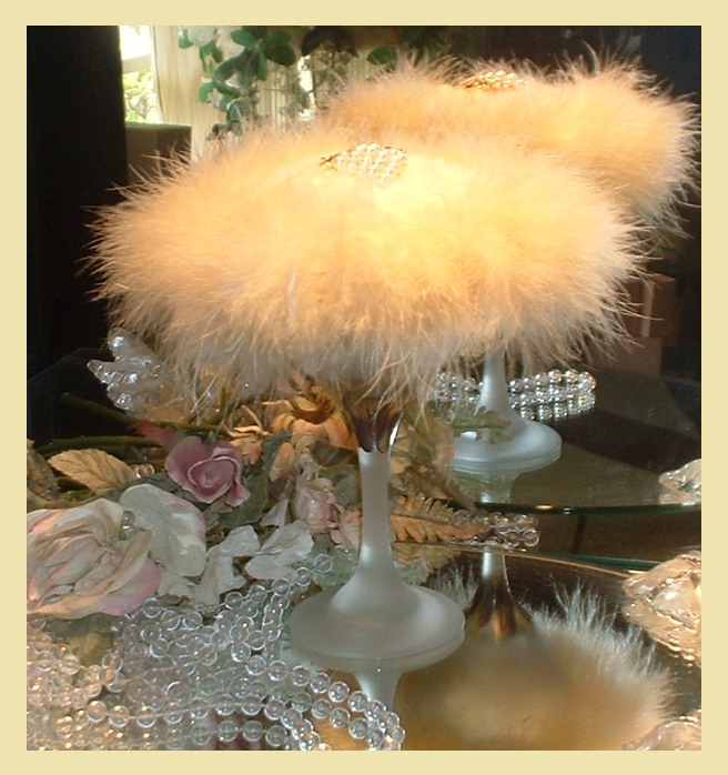 The marabou trimmed faux fur puff is accented a pearl rhinestone handle shaped like a bunch of champagne grapes.