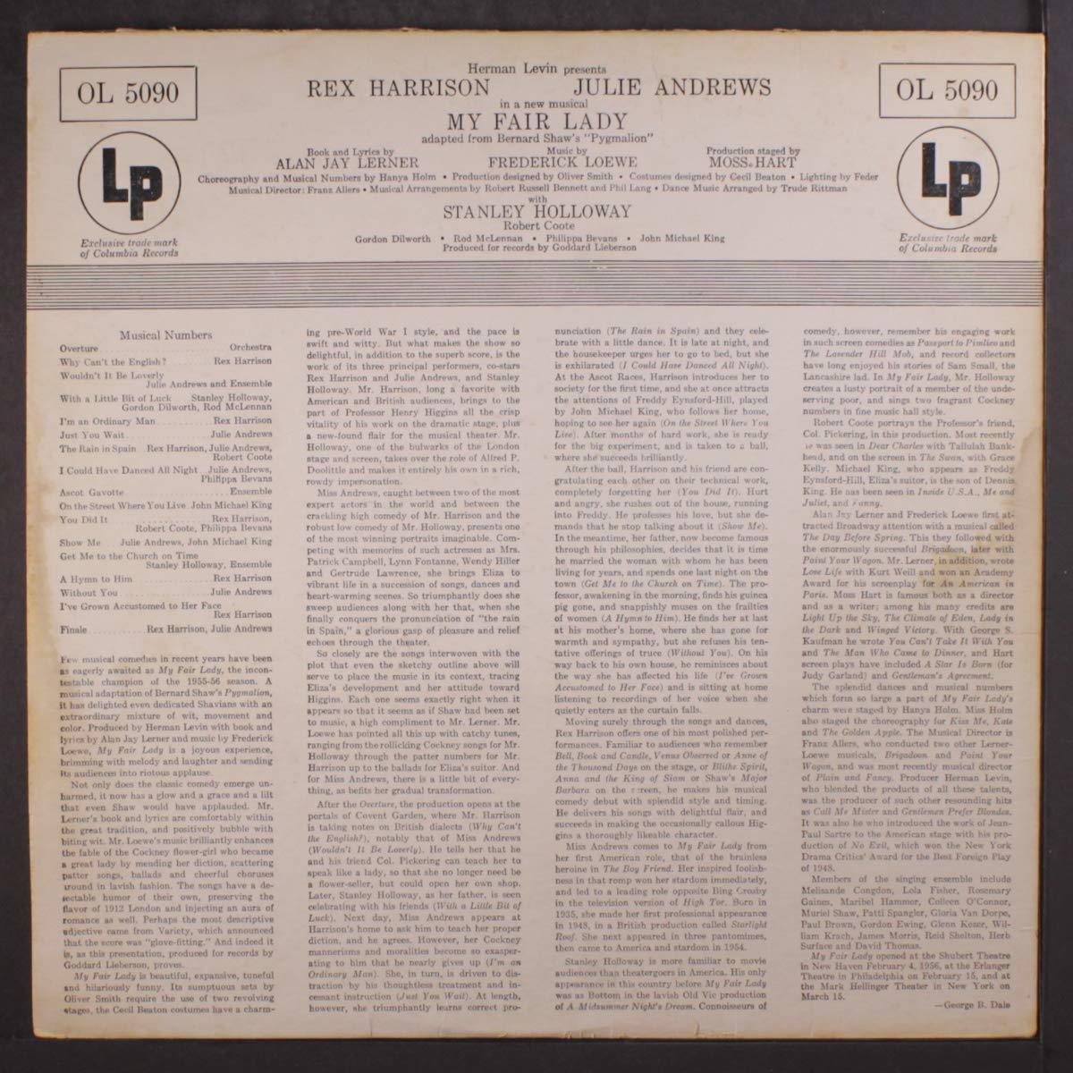 Product description: VINYL LP! My Fair Lady: Original 1956 Broadway Cast! Music by Frederick Loewe. Lyrics by Alan Jay Lerner. Starring Rex Harrison, Julie Andrews and Stanley Holloway. Original 1956 Masterworks MONO Release. TRACKS: A1. Overture / Why Can't the English? - Rex Harrison, Robert Coote and Julie Andrews; A2. Wouldn't It Be Loverly? - Rex Harrison, Robert Coote and Julie Andrews; A3. With a Little Bit of Luck - Stanley Holloway, Gordon Dilworth, Rod McLennan and Chorus; A4. I'm an Ordinary Man - Rex Harrison; A5. Just You Wait - Julie Andrews; A6. The Rain in Spain - Rex Harrison, Julie Andrews, Robert Coote and Ensemble; A7. I Could Have Danced All Night - Julie Andrews, Philippa Bevans and Ensemble; B1. Ascot Gavotte - Chorus; B2. On the Street Where You Live - John Michael King; B3. You Did It - Rex Harrison, Robert Coote, Philippa Bevans and Ensemble; B4. Show Me - Julie Andrews and John Michael King; B5. Get Me to the Church on Time - Stanley Holloway, Gordon Dilworth, Rod McLennan and Chorus; B6. A Hymn to Him - Rex Harrison; B7. Without You - Julie Andrews; B8. I've Grown Accustomed to Her Face - Rex Harrison.