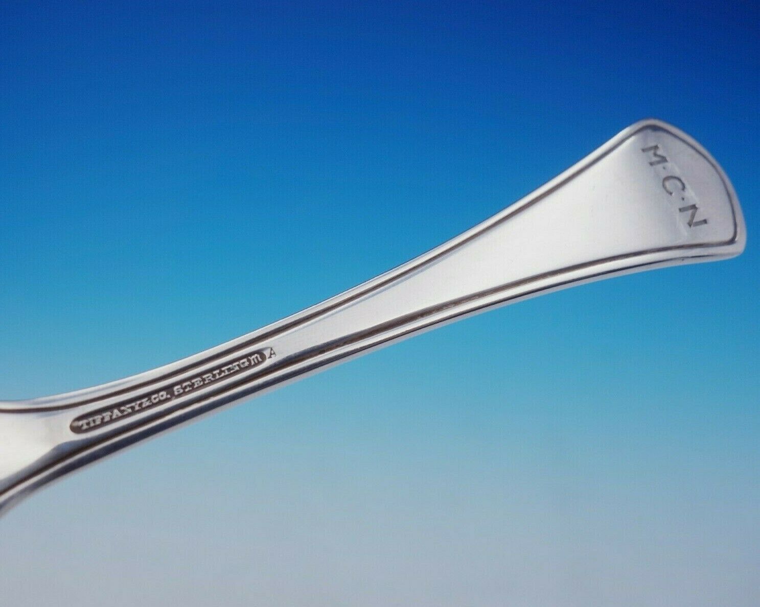 Beautiful Noah's Ark by Tiffany and Co sterling silver 3-piece child's set. The set is acid etched with animals and Noah's Ark. The porringer is marked #23245A with date mark 1947-56, and it measures 1 3/4" tall x 6 1/8" (with handle) x 4 1/4" in diameter. The fork and spoon measure 4 1/2", and the set weighs 8.4 troy ounces. This set has a vintage monogram (see photos) that can be removed upon request. It is in excellent condition. Charming!