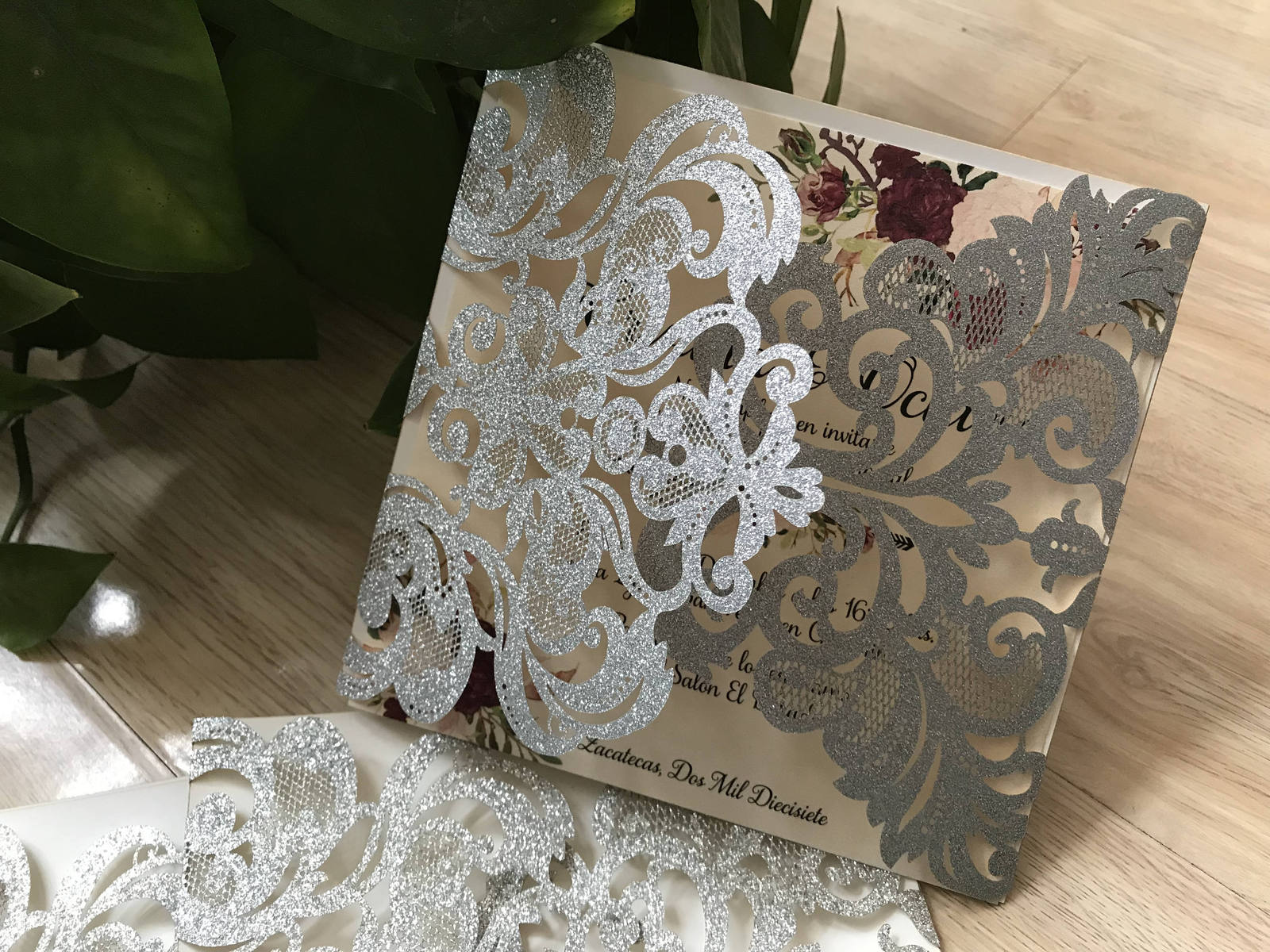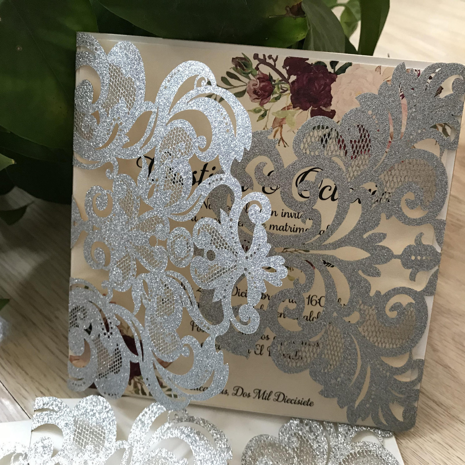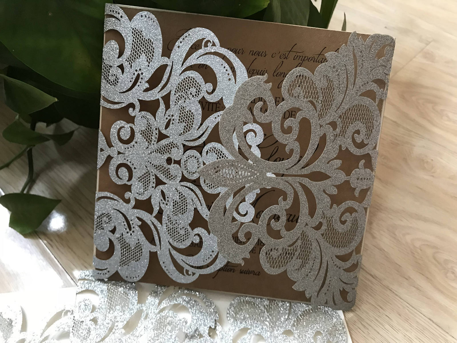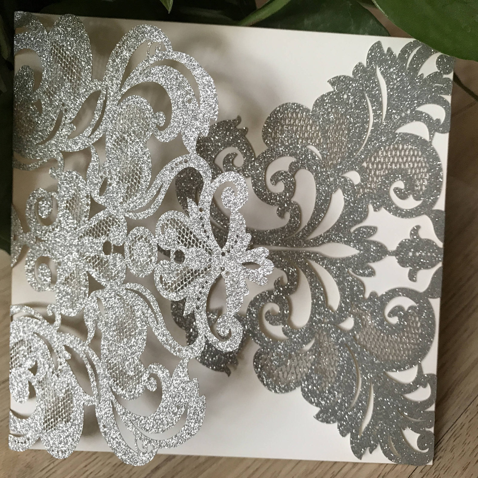 50pcs Glitter Silver Wedding Invitation cards,Laser Cut Invitation Cards,Invite