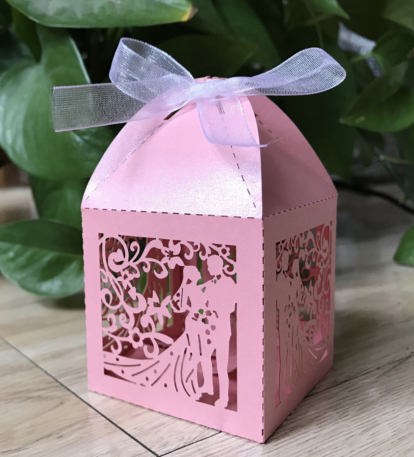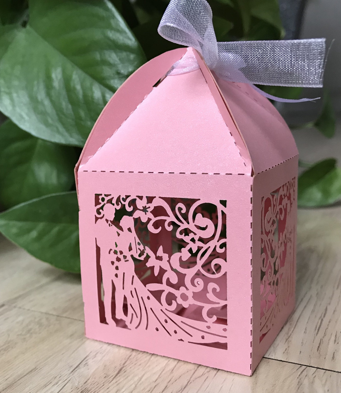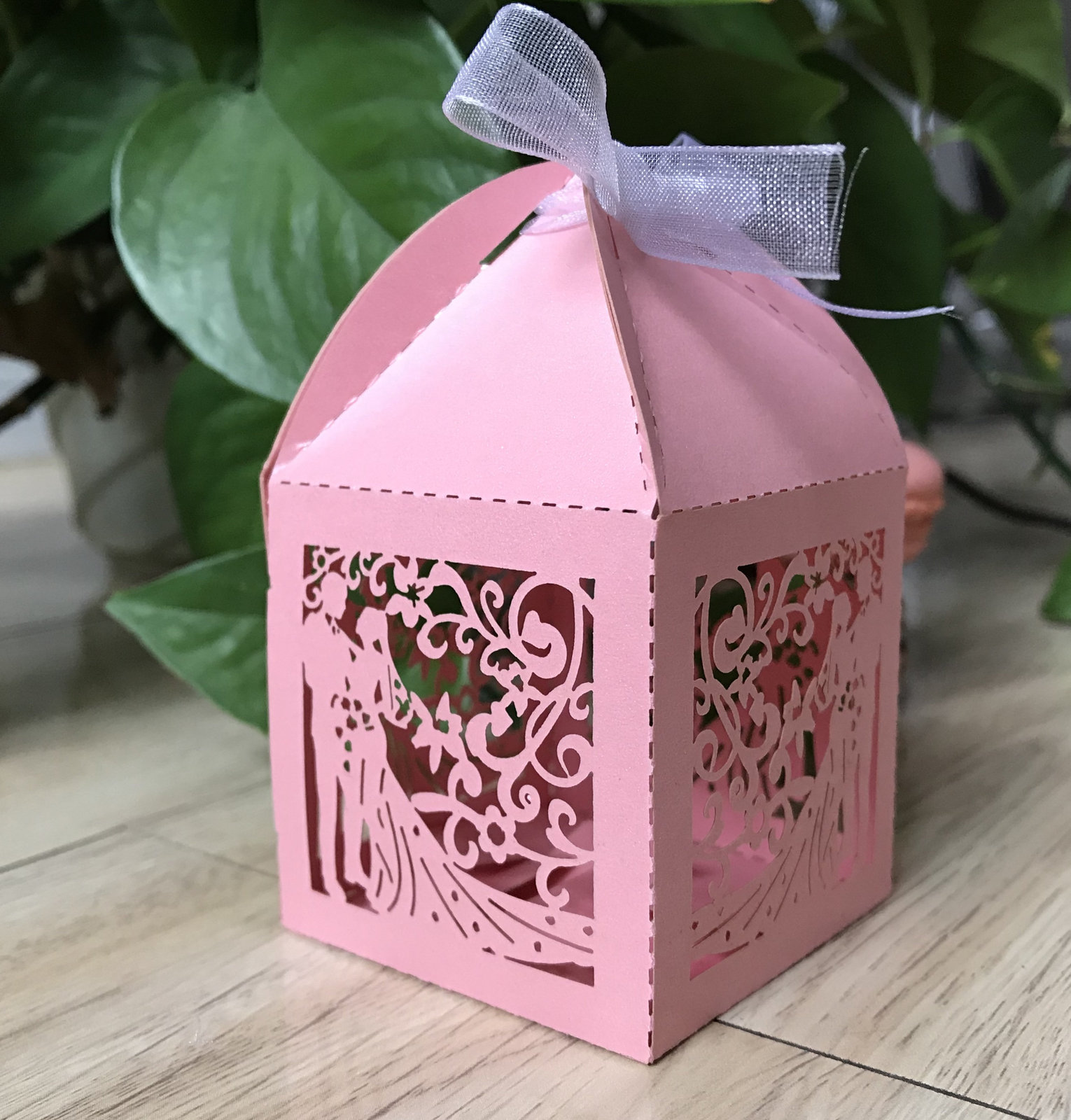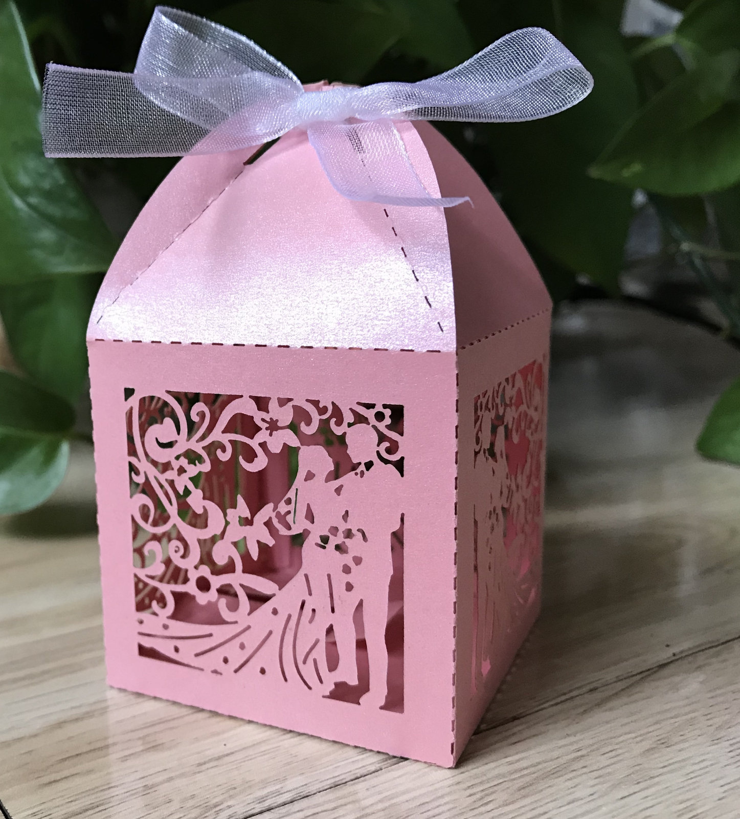 100pcs Pearl Pink Laser Cut Wedding Gift Boxes,Wedding Favor boxes,Chocolate Gift Packaging boxes with ribbon,Cake,Cookie Packaging Boxes