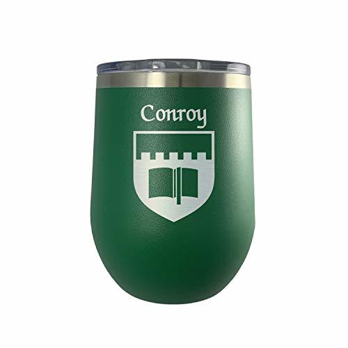 Conroy Irish Coat of Arms Stemless Wine Travel Tumbler - Green. Bring your drink and your Irish pride with you wherever you go with this beautiful travel tumbler. We expertly laser your very own authentic Irish coat of arms and surname into the tumbler's side to reveal it's design in stainless steel. With each mugs metal insulation, your beverage will stay cooler or hotter longer. Comes with a removable lid. Over 1000 available Irish coat of arms names.
