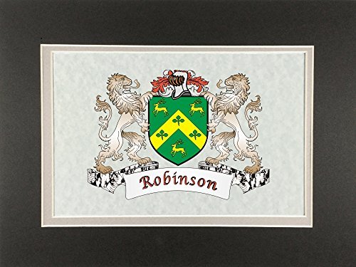 Robinson Irish Coat of Arms Print - Frameable 9" x 12" Authentic Irish coat of arms frameable 9" x 12" inch print. Four piece set includes a high-quality print of your Irish family coat of arms on a heavy 65lb cover weight parchment paper, heavy all-black backing board, and TWO separate matboards. Fits any standard 9" x 12" frame. Authentic Irish coat of arms printPrinted from high quality Vector art filesHeavy duty all-black backing boardNo mounting necessaryTwo separate matboards (inside color: clay, outside color: dark olive)9" x 12" frameable sizeShrink wrapped for deliveryChoose from over 1200 available Irish coat of arms.