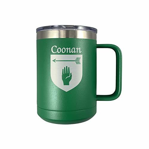 Coonan Irish Coat of Arms Travel Mug with Handle - Green. Bring your drink and your Irish pride with you wherever you go with this beautiful travel mug. We expertly laser your very own authentic Irish coat of arms and surname into the mug's side to reveal it's design in stainless steel. With each mugs metal insulation, your beverage will stay cooler or hotter longer. Comes with a removable lid. Over 1000 available Irish coat of arms names.