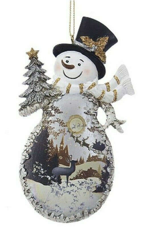 BRAND NEW with Tags KURT ADLER RESIN WINTER WOODS SNOWMAN w/SILVER WINTER SCENE BODY XMAS ORNAMENT