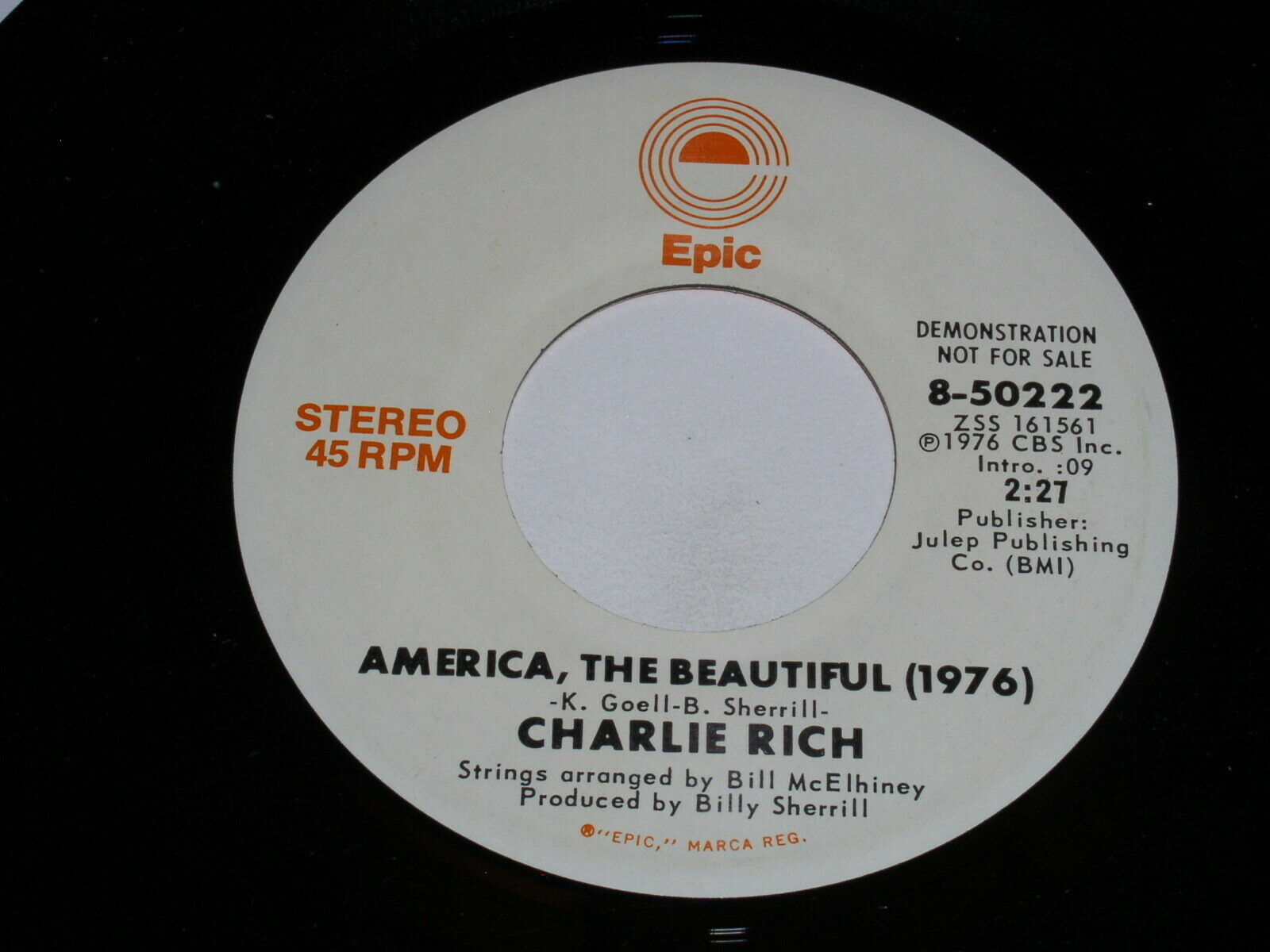 This is an original, promotional 45 rpm phonograph record by Charlie Rich, entitled "America, The Beautiful (1976)". This is the Mono/Stereo issue Record label: Epic 8-50222. Comes with the original Epic paper sleeve, making this all the nicer.