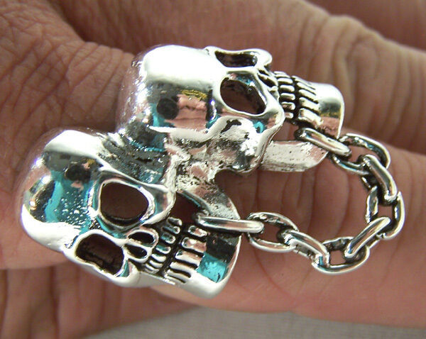 DOUBLE SKULL W CHAIN RING heavy metal biker new BR26 silver mens womens bikers