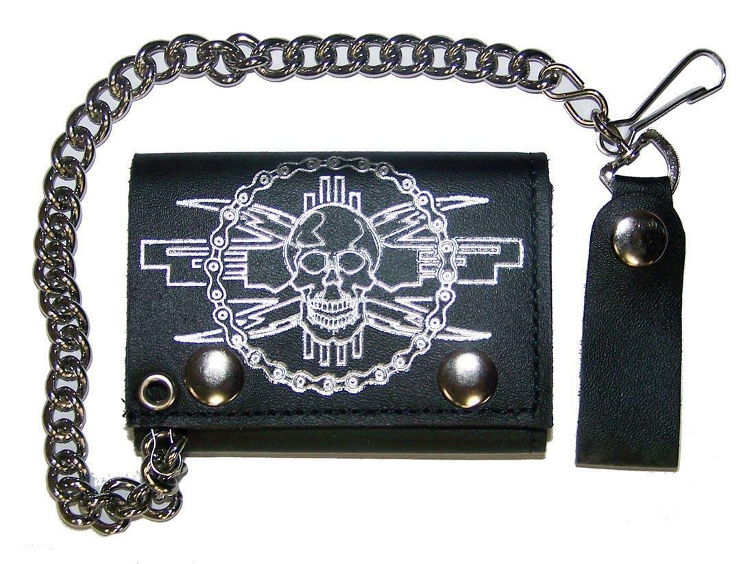 SKULL MOTORCYCLE CHAIN TRIFOLD BIKER WALLET W CHAIN mens LEATHER #611 NEW