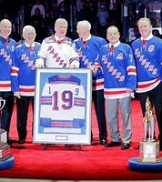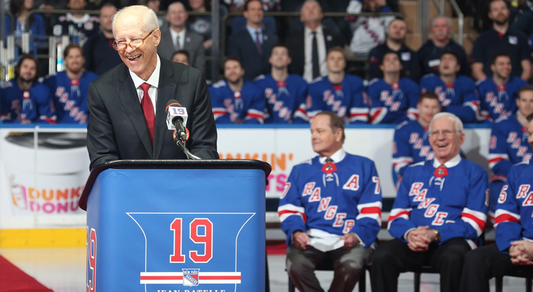 Jean Ratelle Night on Feb. 25, a Rangers legend returned home to Madison Square Garden when Hall of Famer Jean Ratelle had his No. 19 raised to the rafters. Ratelle played parts of 16 season on Broadway, during which he centered the most famous trio in franchise history, the Goal-A-Game line with Rod Gilbert and Vid Hadfield. When his time in New York ended with the 1975-76 season, Ratelle left his stamp on the franchise, ranking second in goals, assists and points in addition to a Bill Masterton Trophy, Lady Byng Trophy, a Ted Lindsay Award and four All-Star games. Ratelle is the ninth player in franchise history to be immortalized with his number being retired, joining former teammates Gilbert, Eddie Giacomin, Harry Howell and Andy Bathgate, as well as recent Blueshirts Mark Messier, Brian Leetch, Mike Richter and Adam Graves.