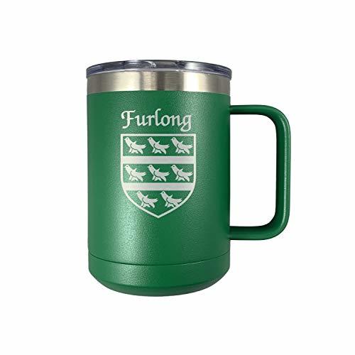 Furlong Irish Coat of Arms Travel Mug with Handle - Green. Bring your drink and your Irish pride with you wherever you go with this beautiful travel mug. We expertly laser your very own authentic Irish coat of arms and surname into the mug's side to reveal it's design in stainless steel. With each mugs metal insulation, your beverage will stay cooler or hotter longer. Comes with a removable lid. Over 1000 available Irish coat of arms names.