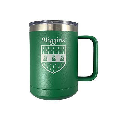 Higgins Irish Coat of Arms Travel Mug with Handle - Green. Bring your drink and your Irish pride with you wherever you go with this beautiful travel mug. We expertly laser your very own authentic Irish coat of arms and surname into the mug's side to reveal it's design in stainless steel. With each mugs metal insulation, your beverage will stay cooler or hotter longer. Comes with a removable lid. Over 1000 available Irish coat of arms names.