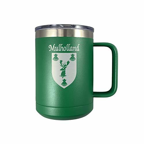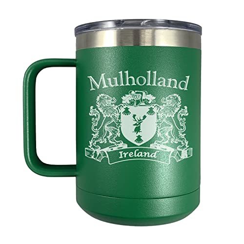 Product description: Mulholland Irish Coat of Arms Travel Mug with Handle - Green. Bring your drink and your Irish pride with you wherever you go with this beautiful travel mug. We expertly laser your very own authentic Irish coat of arms and surname into the mug's side to reveal it's design in stainless steel. With each mugs metal insulation, your beverage will stay cooler or hotter longer. Comes with a removable lid. Over 1000 available Irish coat of arms names.