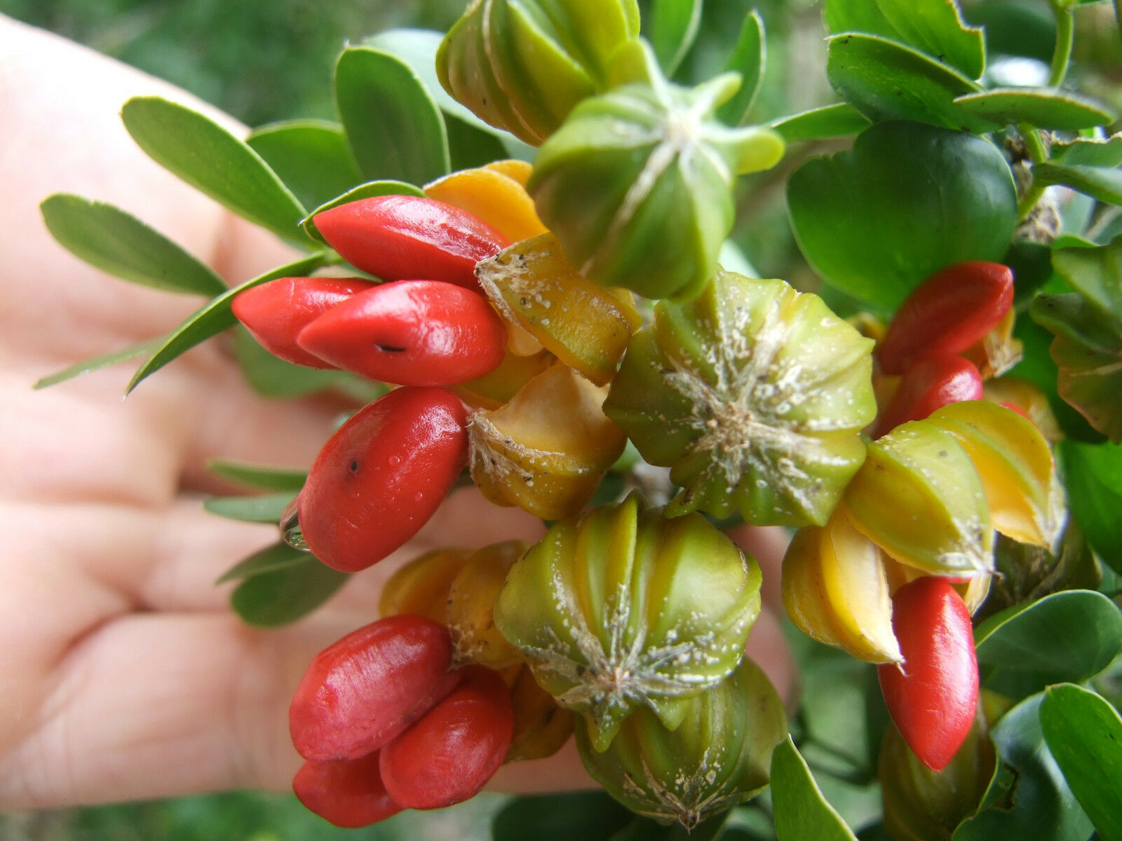 The leaves of the holywood lignum vitae comprise of three to five pairs of dark green leaflets, which measure about three centimetres in length and have a small point at the tip. During the hottest part of the day, the leaflet pairs may sometimes fold together. The fruits of this species have four or five lobes and are bright orange-yellow when mature. They open to expose red, fleshy arils (seed coverings) which contain the hard, black, rounded seeds. The seeds of the holywood lignum vitae measure about one centimetre in length.