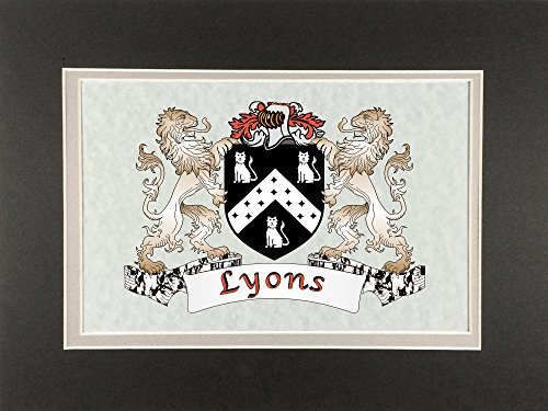 Lyons Irish Coat of Arms Print - Frameable 9" x 12" Authentic Irish coat of arms frameable 9" x 12" inch print. Four piece set includes a high-quality print of your Irish family coat of arms on a heavy 65lb cover weight parchment paper, heavy all-black backing board, and TWO separate matboards. Fits any standard 9" x 12" frame. Authentic Irish coat of arms printPrinted from high quality Vector art filesHeavy duty all-black backing boardNo mounting necessaryTwo separate matboards (inside color: clay, outside color: dark olive)9" x 12" frameable sizeShrink wrapped for deliveryChoose from over 1200 available Irish coat of arms.