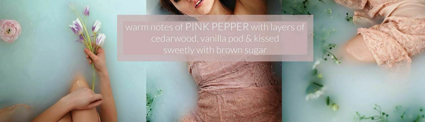 Pink Pepper: Warm notes of pink pepper with layers of cedarwood, vanilla pod and kissed sweetly with brown sugar.