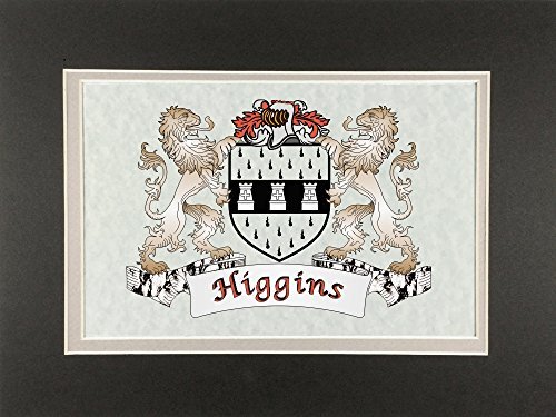 Higgins Irish Coat of Arms Print - Frameable 9" x 12" Authentic Irish coat of arms frameable 9" x 12" inch print. Four piece set includes a high-quality print of your Irish family coat of arms on a heavy 65lb cover weight parchment paper, heavy all-black backing board, and TWO separate matboards. Fits any standard 9" x 12" frame. Authentic Irish coat of arms printPrinted from high quality Vector art filesHeavy duty all-black backing boardNo mounting necessaryTwo separate matboards (inside color: clay, outside color: dark olive)9" x 12" frameable sizeShrink wrapped for deliveryChoose from over 1200 available Irish coat of arms.