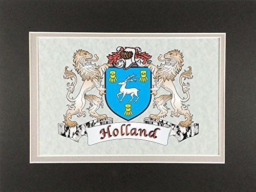 Holland Irish Coat of Arms Print - Frameable 9" x 12" Authentic Irish coat of arms frameable 9" x 12" inch print. Four piece set includes a high-quality print of your Irish family coat of arms on a heavy 65lb cover weight parchment paper, heavy all-black backing board, and TWO separate matboards. Fits any standard 9" x 12" frame. Authentic Irish coat of arms printPrinted from high quality Vector art filesHeavy duty all-black backing boardNo mounting necessaryTwo separate matboards (inside color: clay, outside color: dark olive)9" x 12" frameable sizeShrink wrapped for deliveryChoose from over 1200 available Irish coat of arms.