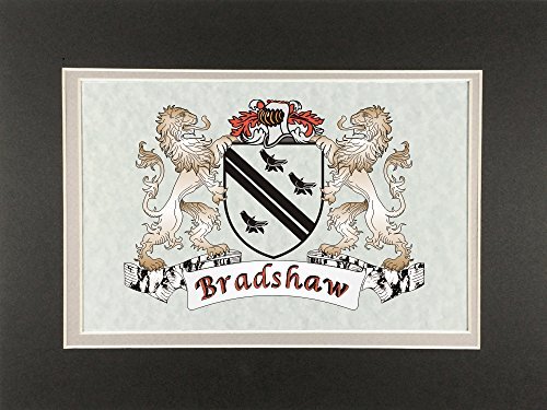 Bradshaw Irish Coat of Arms Print - Frameable 9" x 12" Authentic Irish coat of arms frameable 9" x 12" inch print. Four piece set includes a high-quality print of your Irish family coat of arms on a heavy 65lb cover weight parchment paper, heavy all-black backing board, and TWO separate matboards. Fits any standard 9" x 12" frame. Authentic Irish coat of arms printPrinted from high quality Vector art filesHeavy duty all-black backing boardNo mounting necessaryTwo separate matboards (inside color: clay, outside color: dark olive)9" x 12" frameable sizeShrink wrapped for deliveryChoose from over 1200 available Irish coat of arms.