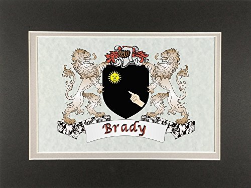 Brady Irish Coat of Arms Print - Frameable 9" x 12" Authentic Irish coat of arms frameable 9" x 12" inch print. Four piece set includes a high-quality print of your Irish family coat of arms on a heavy 65lb cover weight parchment paper, heavy all-black backing board, and TWO separate matboards. Fits any standard 9" x 12" frame. Authentic Irish coat of arms printPrinted from high quality Vector art filesHeavy duty all-black backing boardNo mounting necessaryTwo separate matboards (inside color: clay, outside color: dark olive)9" x 12" frameable sizeShrink wrapped for deliveryChoose from over 1200 available Irish coat of arms.