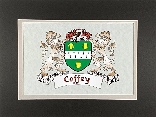 Coffey Irish Coat of Arms Print - Frameable 9" x 12" Authentic Irish coat of arms frameable 9" x 12" inch print. Four piece set includes a high-quality print of your Irish family coat of arms on a heavy 65lb cover weight parchment paper, heavy all-black backing board, and TWO separate matboards. Fits any standard 9" x 12" frame. Authentic Irish coat of arms printPrinted from high quality Vector art filesHeavy duty all-black backing boardNo mounting necessaryTwo separate matboards (inside color: clay, outside color: dark olive)9" x 12" frameable sizeShrink wrapped for deliveryChoose from over 1200 available Irish coat of arms.