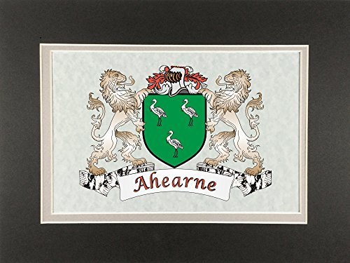 Ahearn Irish Coat of Arms Print - Frameable 9" x 12" Authentic Irish coat of arms frameable 9" x 12" inch print. Four piece set includes a high-quality print of your Irish family coat of arms on a heavy 65lb cover weight parchment paper, heavy all-black backing board, and TWO separate matboards. Fits any standard 9" x 12" frame. Authentic Irish coat of arms printPrinted from high quality Vector art filesHeavy duty all-black backing boardNo mounting necessaryTwo separate matboards (inside color: clay, outside color: dark olive)9" x 12" frameable sizeShrink wrapped for deliveryChoose from over 1200 available Irish coat of arms.