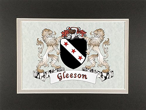 Gleeson Irish Coat of Arms Print - Frameable 9" x 12" Authentic Irish coat of arms frameable 9" x 12" inch print. Four piece set includes a high-quality print of your Irish family coat of arms on a heavy 65lb cover weight parchment paper, heavy all-black backing board, and TWO separate matboards. Fits any standard 9" x 12" frame. Authentic Irish coat of arms printPrinted from high quality Vector art filesHeavy duty all-black backing boardNo mounting necessaryTwo separate matboards (inside color: clay, outside color: dark olive)9" x 12" frameable sizeShrink wrapped for deliveryChoose from over 1200 available Irish coat of arms.
