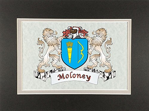 Product description: Moloney Irish Coat of Arms Print - Frameable 9" x 12" Authentic Irish coat of arms frameable 9" x 12" inch print. Four piece set includes a high-quality print of your Irish family coat of arms on a heavy 65lb cover weight parchment paper, heavy all-black backing board, and TWO separate matboards. Fits any standard 9" x 12" frame. Authentic Irish coat of arms printPrinted from high quality Vector art filesHeavy duty all-black backing boardNo mounting necessaryTwo separate matboards (inside color: clay, outside color: dark olive)9" x 12" frameable sizeShrink wrapped for deliveryChoose from over 1200 available Irish coat of arms.