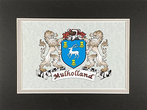 Mulholland Irish Coat of Arms Print - Frameable 9" x 12" Authentic Irish coat of arms frameable 9" x 12" inch print. Four piece set includes a high-quality print of your Irish family coat of arms on a heavy 65lb cover weight parchment paper, heavy all-black backing board, and TWO separate matboards. Fits any standard 9" x 12" frame. Authentic Irish coat of arms printPrinted from high quality Vector art filesHeavy duty all-black backing boardNo mounting necessaryTwo separate matboards (inside color: clay, outside color: dark olive)9" x 12" frameable sizeShrink wrapped for deliveryChoose from over 1200 available Irish coat of arms.